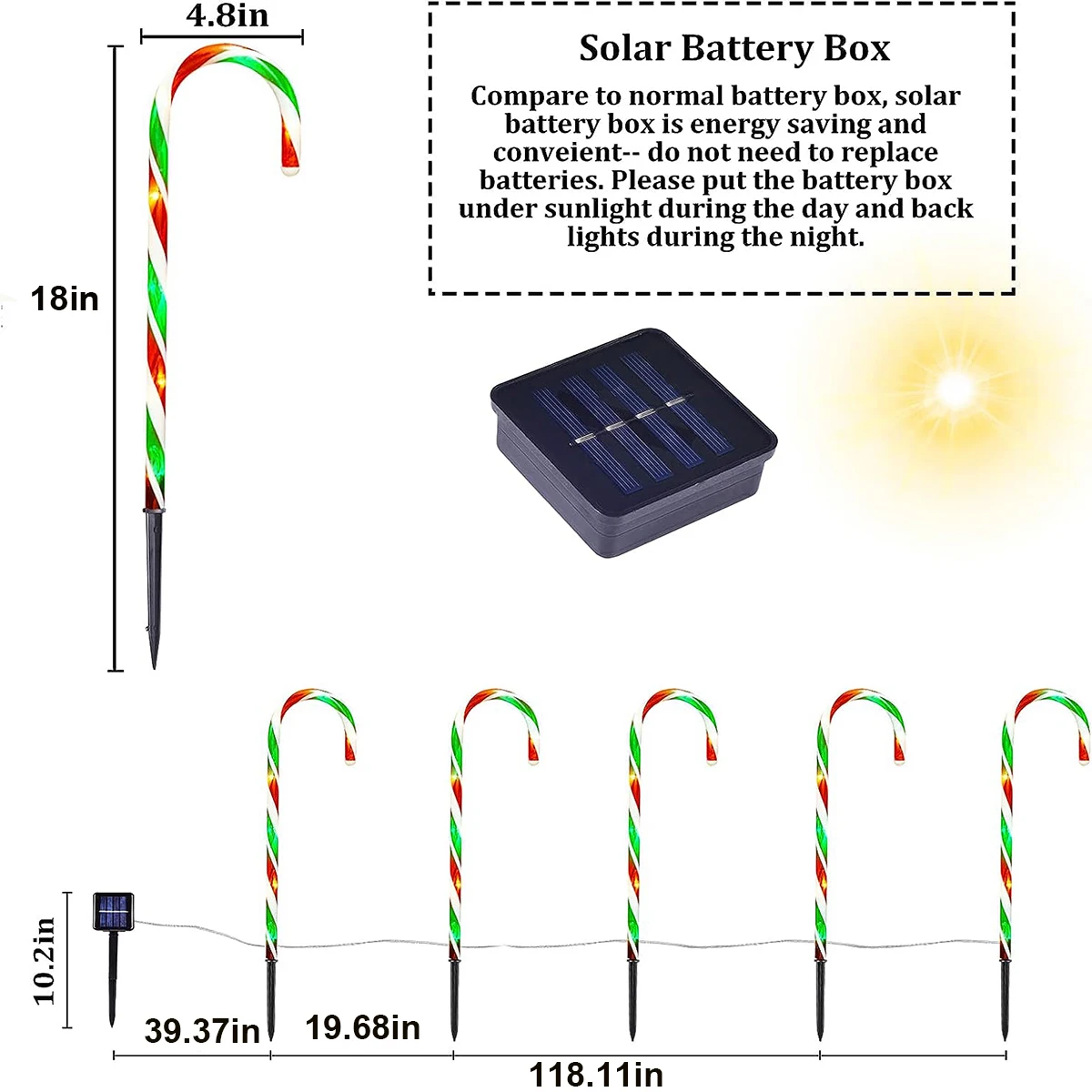 【Energy Efficient & Auto ON/OFF】The Christmas pathway lights are powered entirely by the sun. No need pay for extra electricity bills. Just turn on the switch button on the back of the solar panel. With built-in light sensor, the candy cane decorations turn on automatically at dusk and turns off at dawn. They can light up to 8-10 hours at night after a fully charge of 6-8 hours.