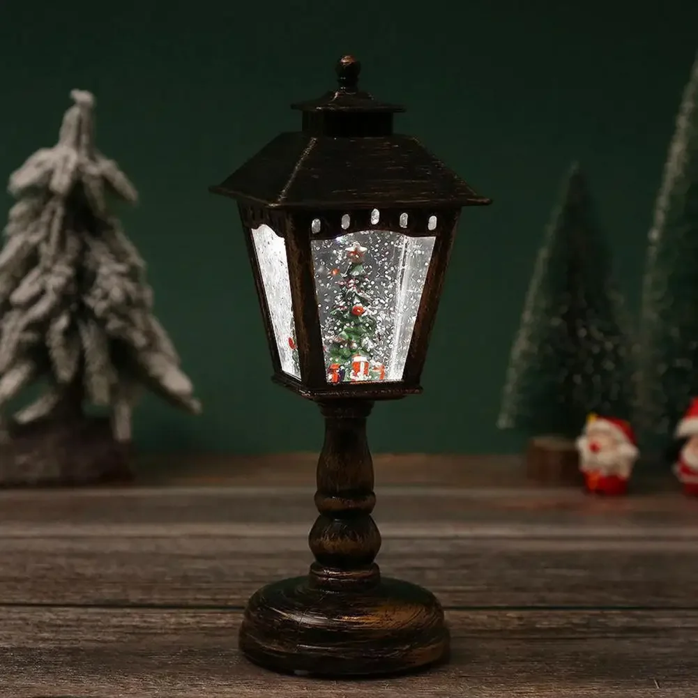 Enjoy the magical ambiance created by the Santa Claus, snowman, and Christmas tree figures illuminated under the lamp’s light.
