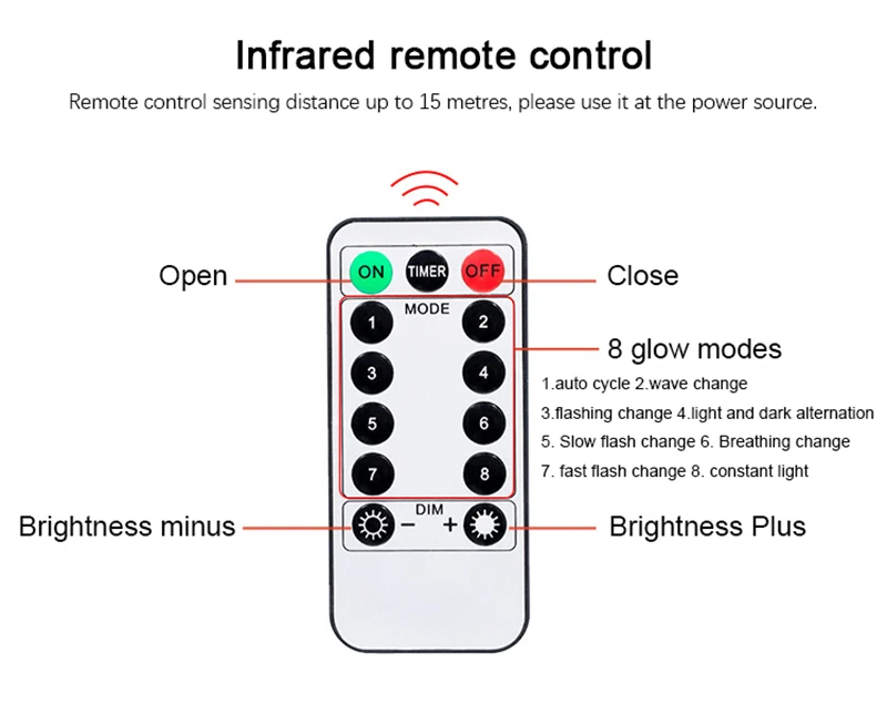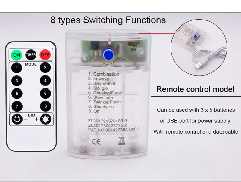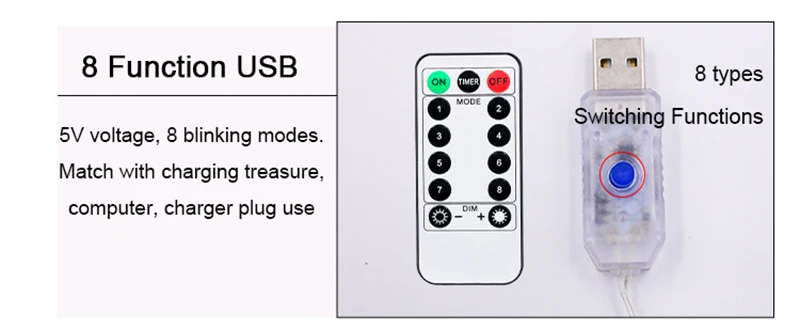 USB: 3m:always-on mode; 3M-8 mode: 8 light modes + remote control